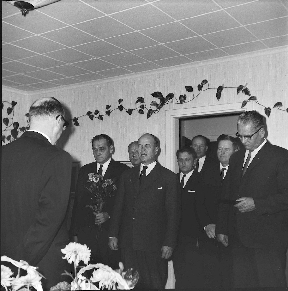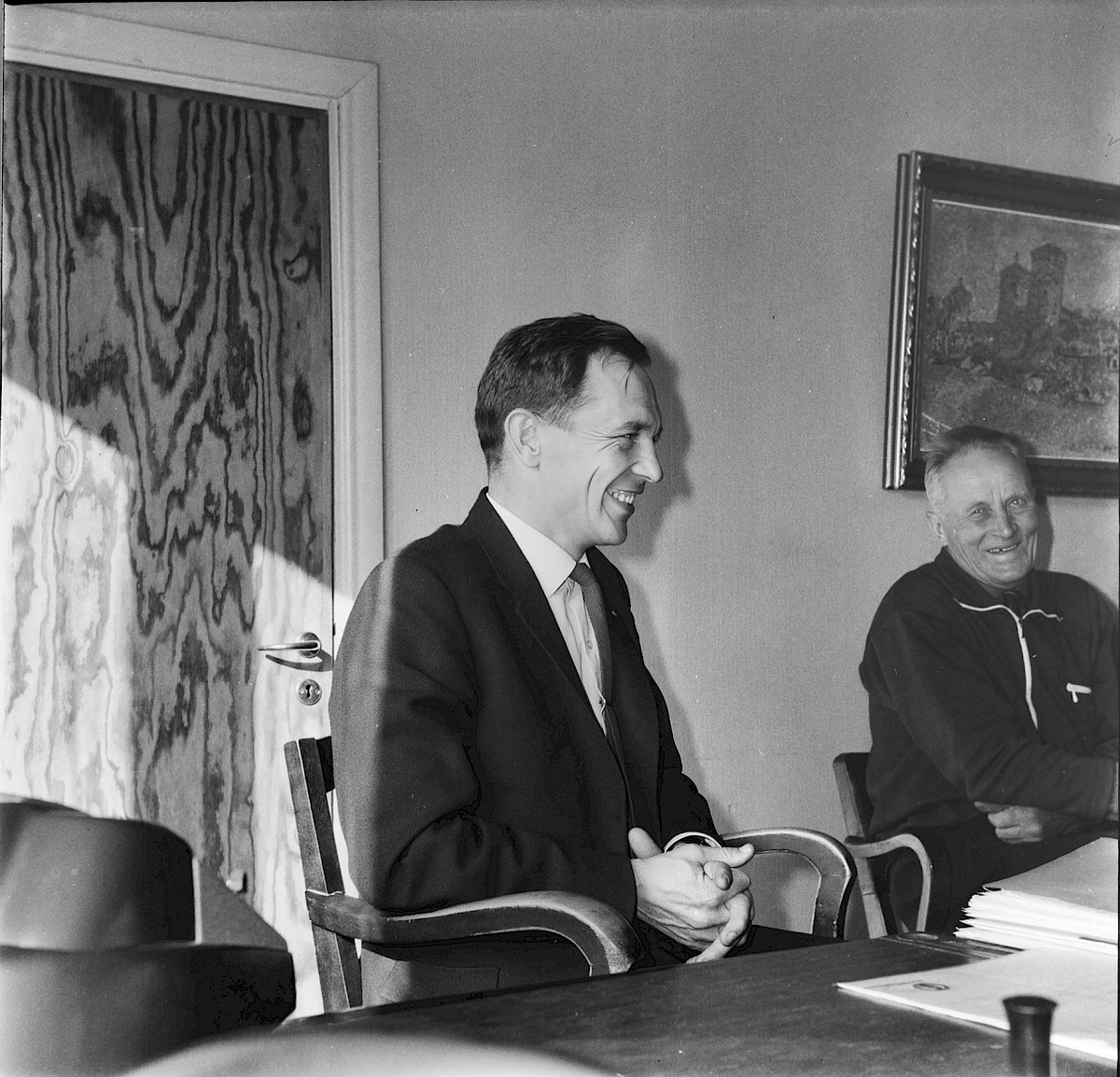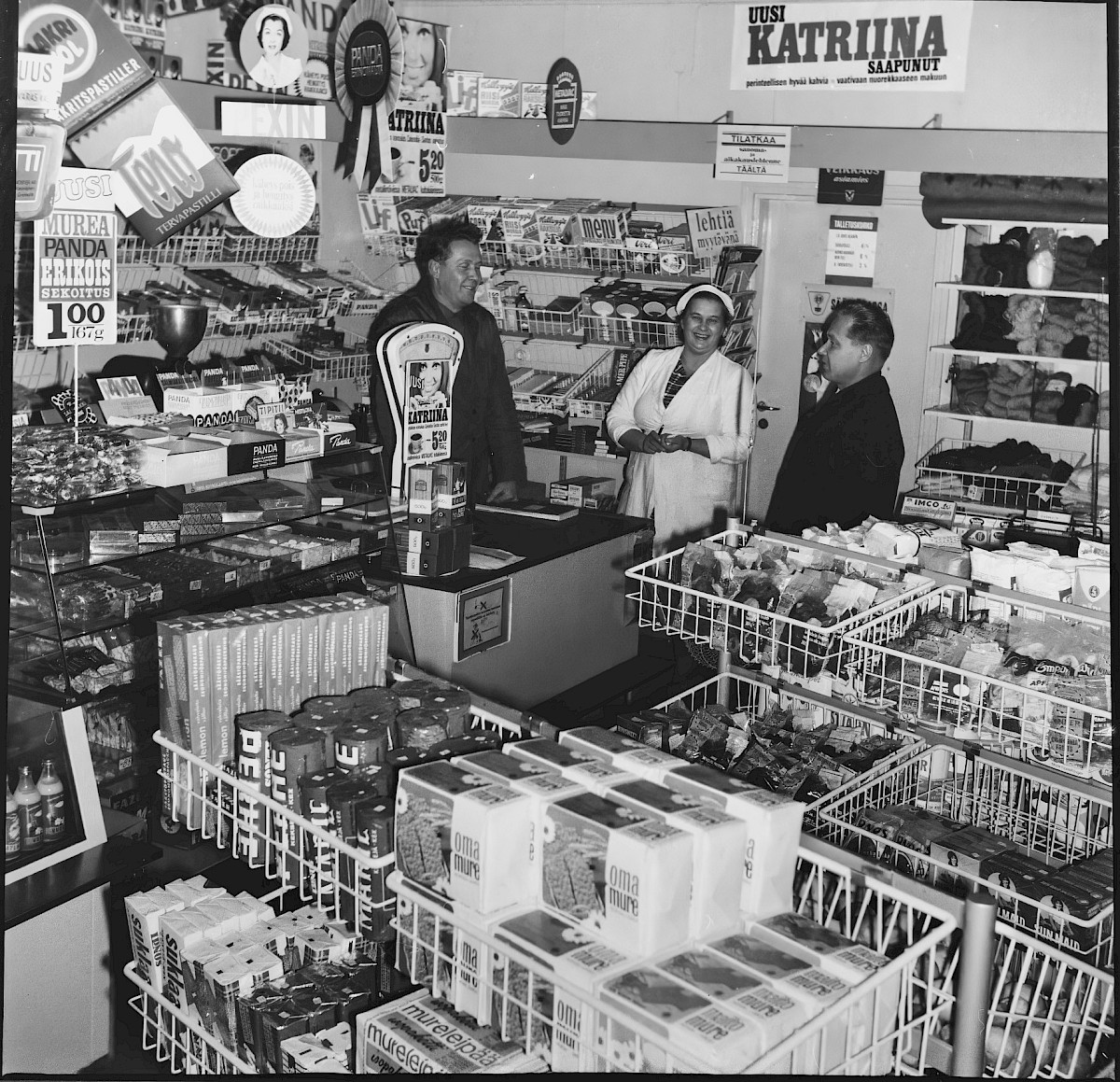 Kuva-arkisto 9.1.2024 00:02 Rantasalmen Lehti 3-1966 Toimitus 22.10.1966 Kolkontaipaleen Osuuskaupassa isännöivät Turuset joita toimitusjohtaja Toivo Pulkkinen (oik) on myymäläkierroksellaan pistäytynyt tapaamassa.