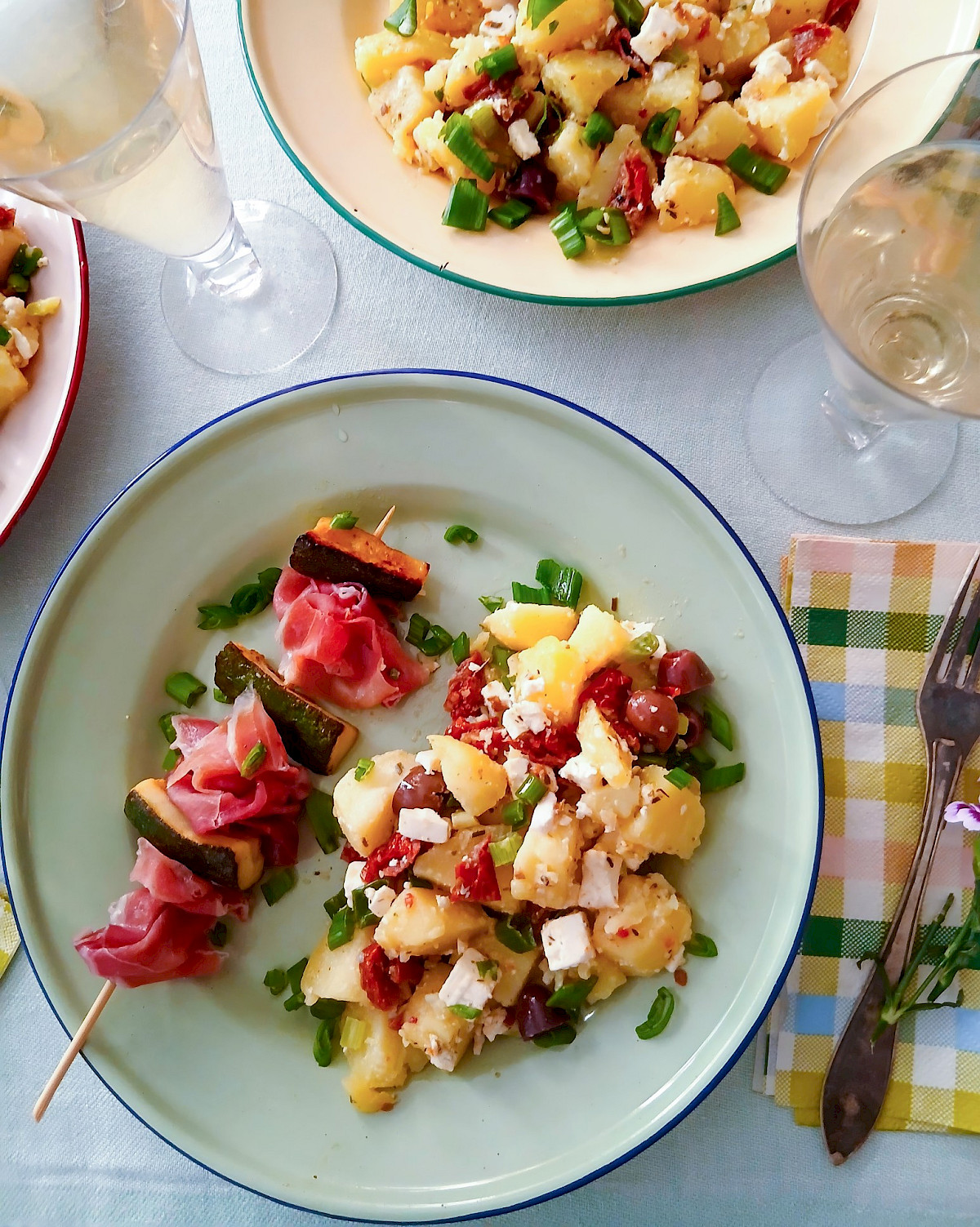 Tarjoile vappupöydässä perunasalaattia, joka lainaa makujaan värimerellisestä keittiöstä. Perunat jalostuvat hyvän kastikkeen kanssa salonkikelpoisiksi.